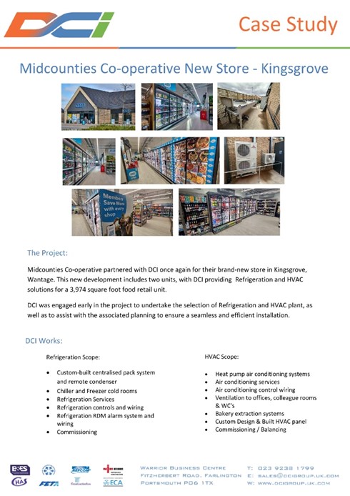 Brand New Co-Op Opens in Southmoor Oxford DCI's involvement on this project included the design and installation of the new stores Refrigeration & HVAC systems Refrigeration Works:Custom-built centralised pack system and remot ...